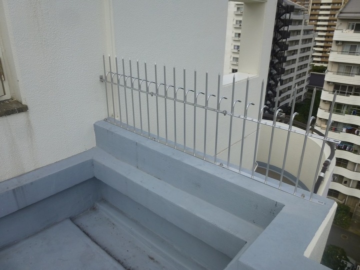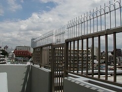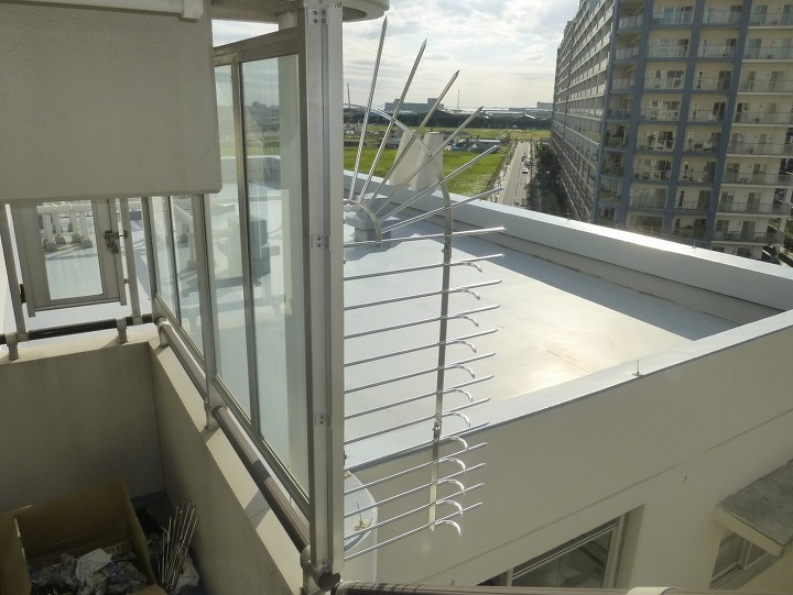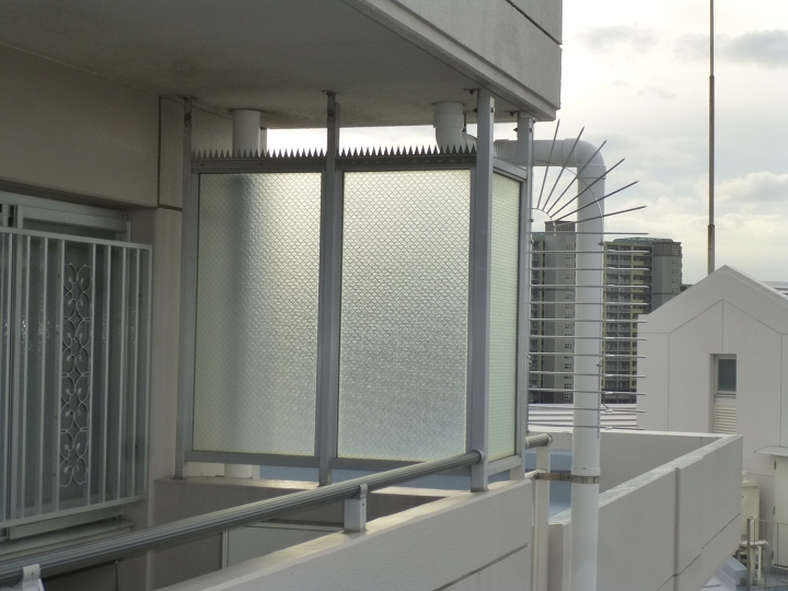 このマンションでは、子供が手摺を乗り越えて隣接するルーフバルコニーに侵入したりして、大変危険な行為が見受けられたため、事故防止の観点から忍び返しを設置しました。