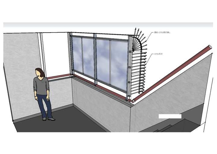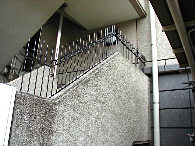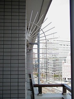 手摺りの上部壁面にステンレス製の扇形忍び返しを特注で製作し取り付けました(下部は通常サイズ品を連結)。