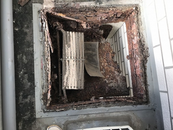 この事例では、ベランダで飼っていたペットの排尿が原因で腐食してしまった避難ハッチを交換しています。意外と多い事例なんです。