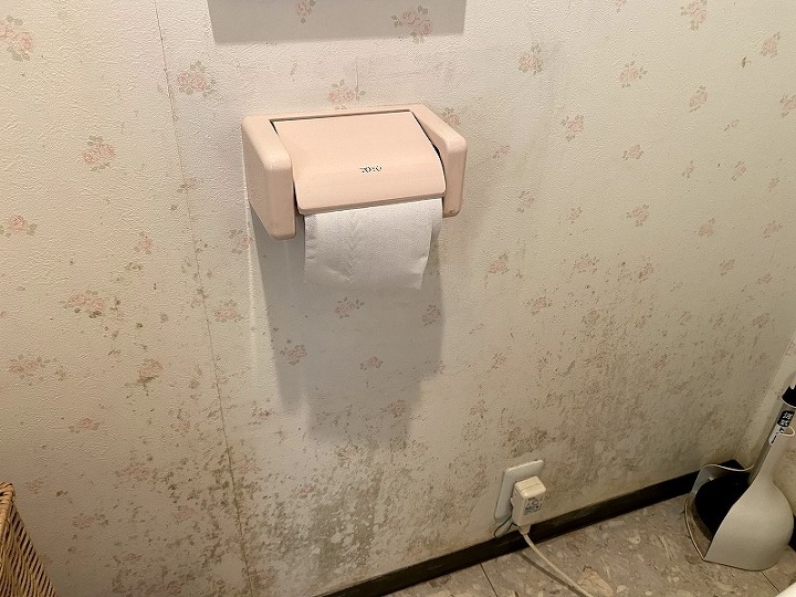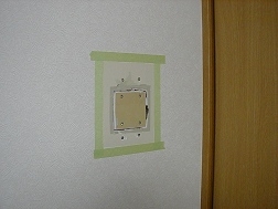 養生に貼ったテープの上に同じ柄の壁紙を合わせ、重ね切りし、壁側のカットした部分を剥がし、ローラーで念入りに押さえます。
